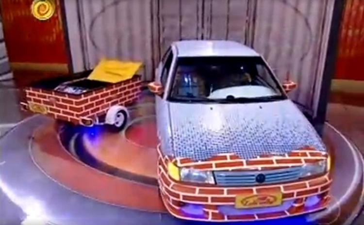 O carro recebeu uma bela plotagem simulando tijolos e azulejos, colher de pedreiro como maçanetas, marreta como cambio e de bônus uma carretinha pavorosa.